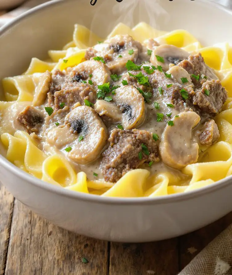 A classic comfort food dish featuring tender beef in a creamy mushroom sauce served over egg noodles.
