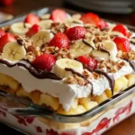 Press the mixture firmly into the bottom of a greased 9×13-inch baking dish to create an even crust.Refrigerate the crust while preparing the filling.2️⃣Make the Filling:In a large bowl, beat the softened cream cheese with sugar and vanilla extract until smooth and creamy.Gently fold in the whipped topping until fully combined.Spread the filling evenly over the chilled crust, smoothing the top with a spatula.3️⃣Add the Layers:Arrange banana slices evenly over the filling.Spread the well-drained crushed pineapple over the bananas.Add a layer of sliced strawberries on top of the pineapple.4️⃣Top and Chill:Spread another layer of whipped topping over the strawberries.Drizzle chocolate sauce over the whipped topping and sprinkle with chopped hazelnuts.Cover the dish with plastic wrap and refrigerate for at least 4 hours, or preferably overnight, to set the layers.5️⃣Serve:Slice the cake into squares and serve chilled. Enjoy the sweet and fruity goodness of this no-bake dessert!
