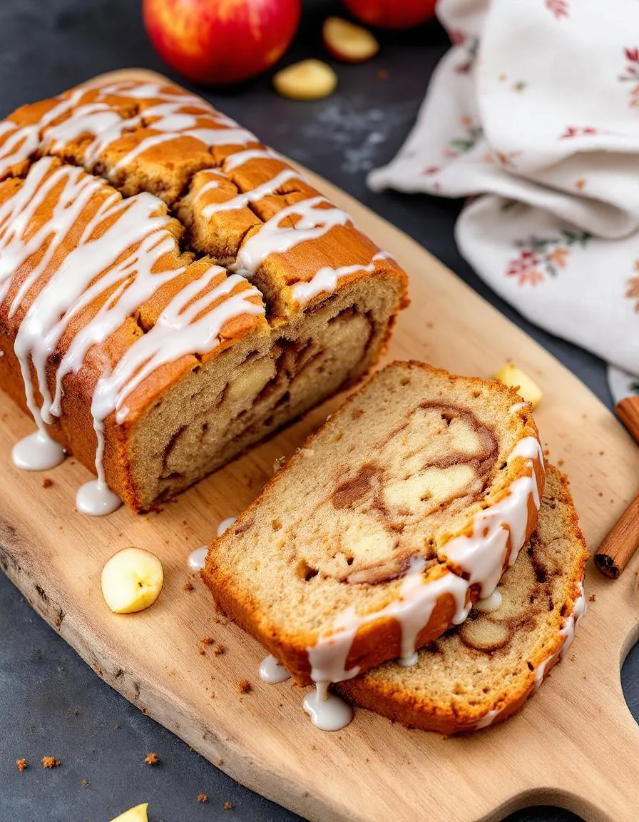 A moist, spiced quick bread swirled with cinnamon-sugar apples and topped with a sweet glaze, perfect for autumn mornings.