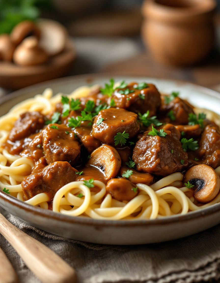 Noodles: Egg noodles are traditional in this dish for their ability to absorb the savory flavors of the beef gravy. They are a source of carbohydrates, providing energy. Opt for fresh or dried varieties based on preference; for extra nutrition, whole grain noodles are a great choice. Noodles can be stored in a cool, dry place, and dried options last longer than fresh. If you need a gluten-free version, consider alternatives like rice noodles or zucchini noodles.