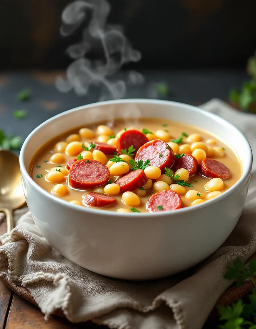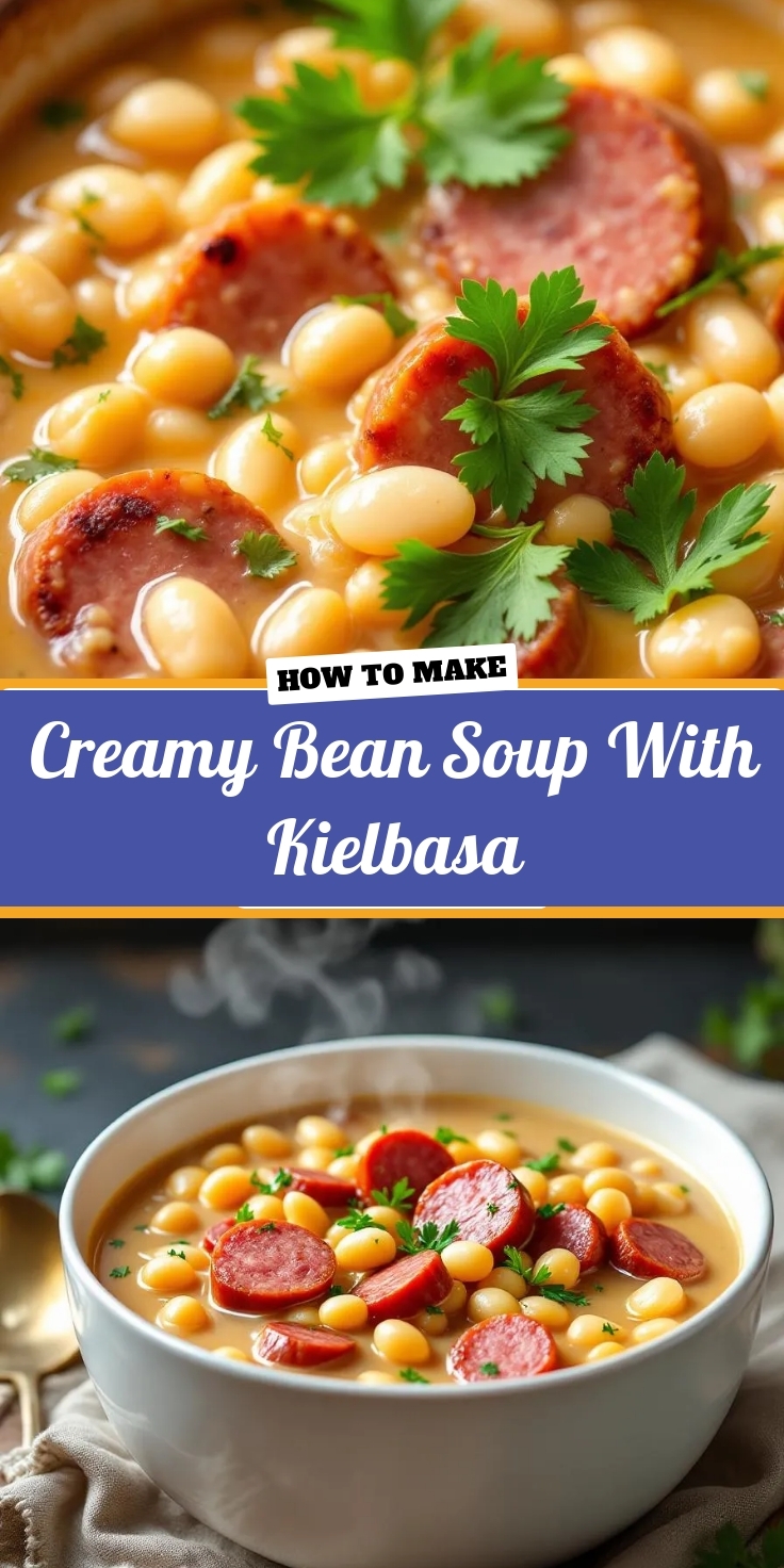 A hearty and comforting soup featuring creamy beans and savory kielbasa sausage, perfect for a cozy meal.