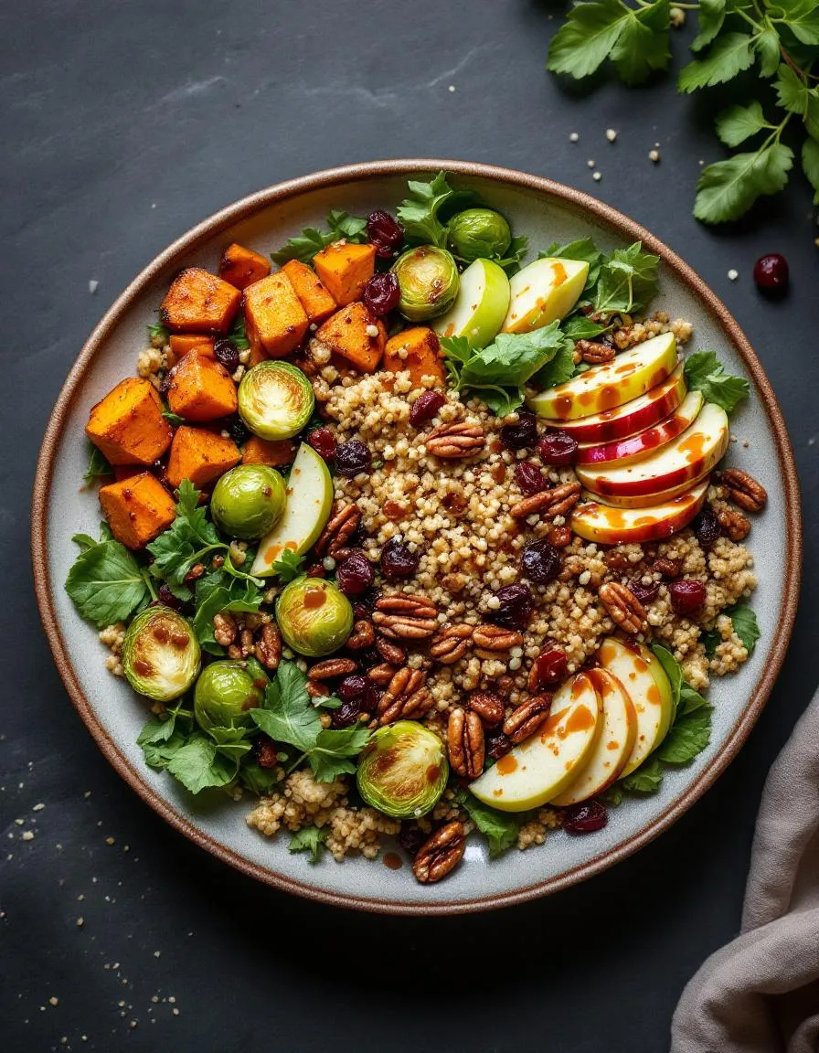 - Assemble bowls with mixed greens, quinoa, roasted vegetables, apple slices, pecans, and cranberries.