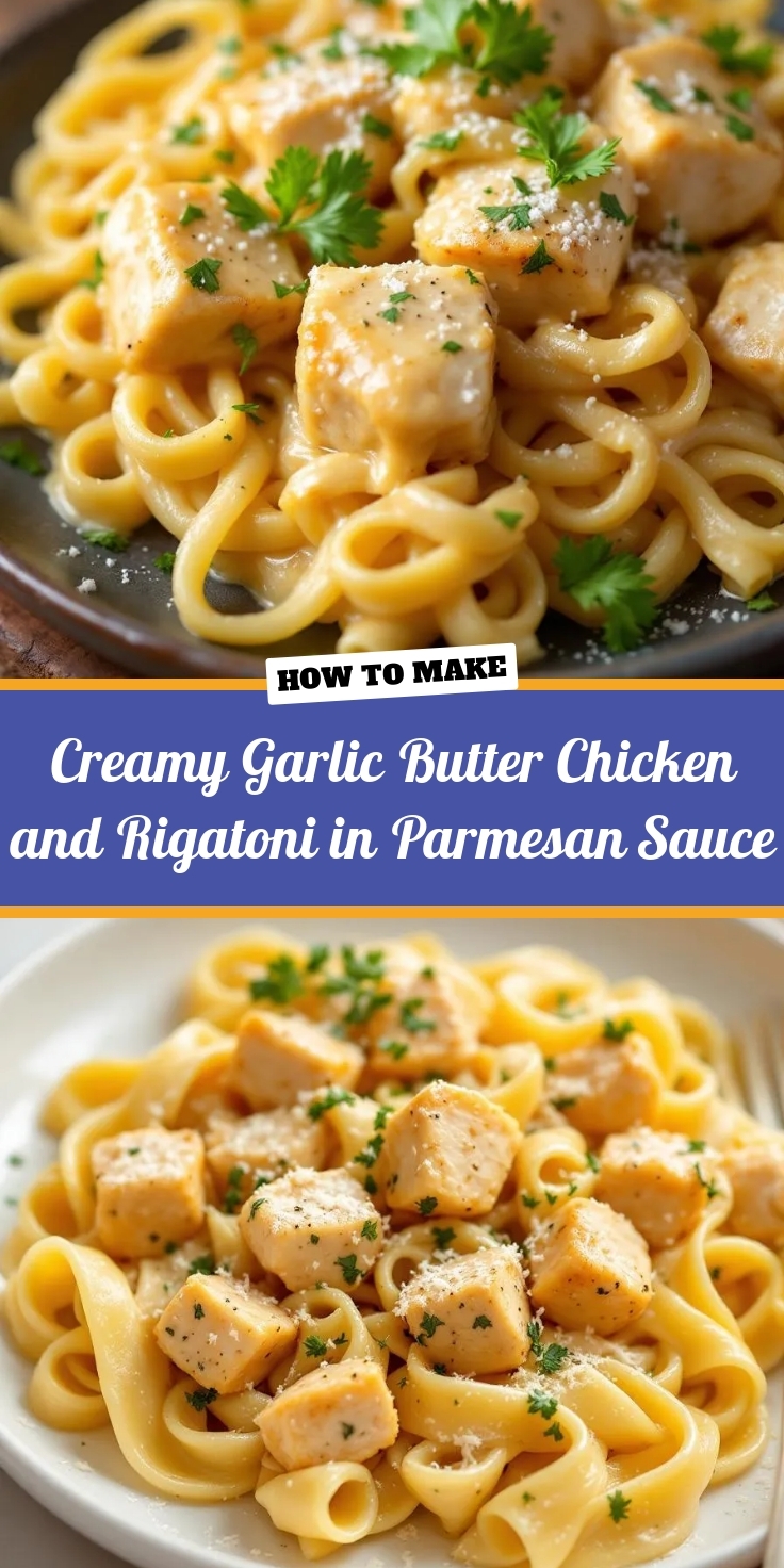 Creamy Garlic Butter Chicken and Rigatoni in Parmesan Sauce delivers a rich, indulgent experience with every bite. The tender chicken, seared to golden perfection, melts in your mouth while the garlic butter infuses it with a fragrant, savory depth. Meanwhile, the rigatoni noodles soak up the velvety Parmesan sauce, creating a luscious, creamy texture that clings to each piece. Fresh herbs like parsley add a bright, earthy note, balancing the dish’s richness. Every forkful of Creamy Garlic Butter Chicken and Rigatoni in Parmesan Sauce offers a harmonious blend of chewy pasta, succulent chicken, and a sauce that’s both silky and deeply flavorful.