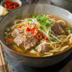 A flavorful Vietnamese soup featuring rice noodles, beef broth, herbs, and spices.