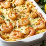 11. Remove the shrimp from the skillet and set aside.5️⃣Prepare Sauce:Deglaze the skillet by pouring in white wine (or chicken broth), scraping up any browned bits from the bottom of the pan.Let it simmer for 2 minutes.Stir in lemon juice, lemon zest, and heavy cream. Bring the mixture to a gentle simmer.6️⃣Toss Pasta:Add the cooked pasta to the skillet and toss until the noodles are evenly coated in the creamy sauce.Season with salt and pepper to taste.7️⃣Assemble Dish:Transfer the pasta and sauce mixture to a large baking dish, spreading it out evenly.Arrange the cooked shrimp on top of the pasta.8️⃣Add Cheese:Sprinkle the grated Parmesan cheese and shredded mozzarella evenly over the pasta and shrimp.9️⃣Bake:Place the baking dish in the preheated oven and bake for 15–20 minutes, or until the cheese is melted and bubbly.🔟Garnish and Serve:Remove the dish from the oven. Garnish with chopped fresh parsley and serve hot.