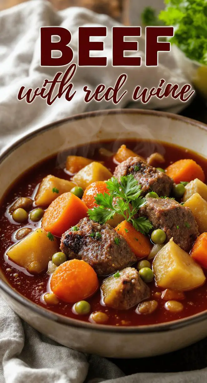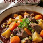 The rich, wine-infused broth pairs beautifully with tender chunks of beef and fresh vegetables, creating a hearty beef stew that feels like a hug in a bowl.