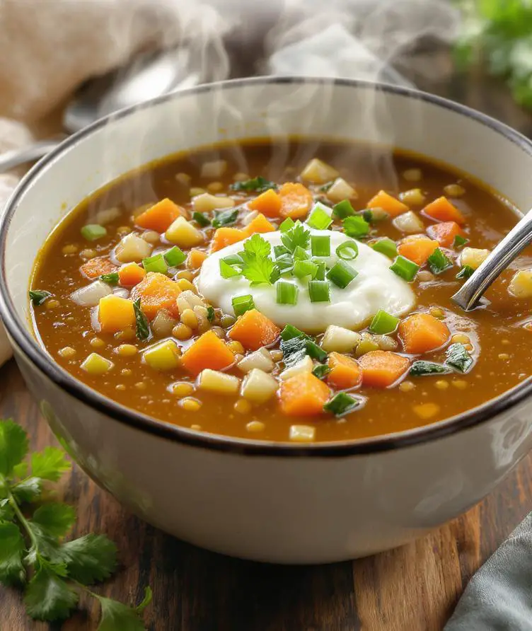 A comforting and hearty soup made with lentils, mixed vegetables, and aromatic spices. Perfect for a cozy meal, packed with protein and fiber.