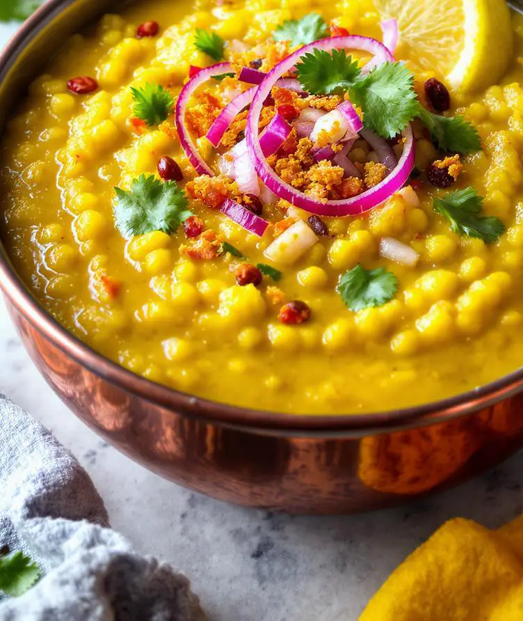 This Indian dal tadka recipe is all about simplicity meeting bold, irresistible flavors. At its core, it’s a classic lentil curry made from toor dal (split pigeon peas), simmered to perfection and finished with a sizzling tadka of spices, ghee, and herbs.