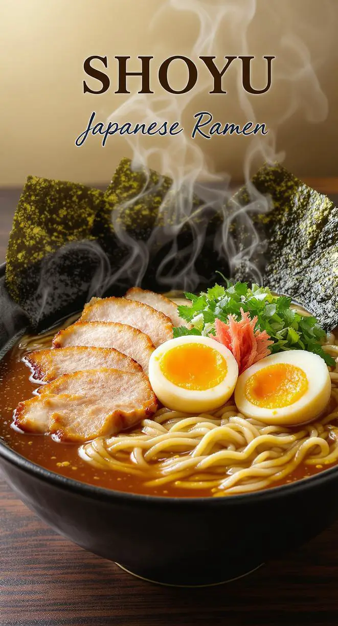 Authentic Japanese shoyu ramen features a flavorful soy sauce-based broth, tender chashu pork, soft-boiled eggs, and fresh noodles, creating a comforting and savory bowl of soup.
