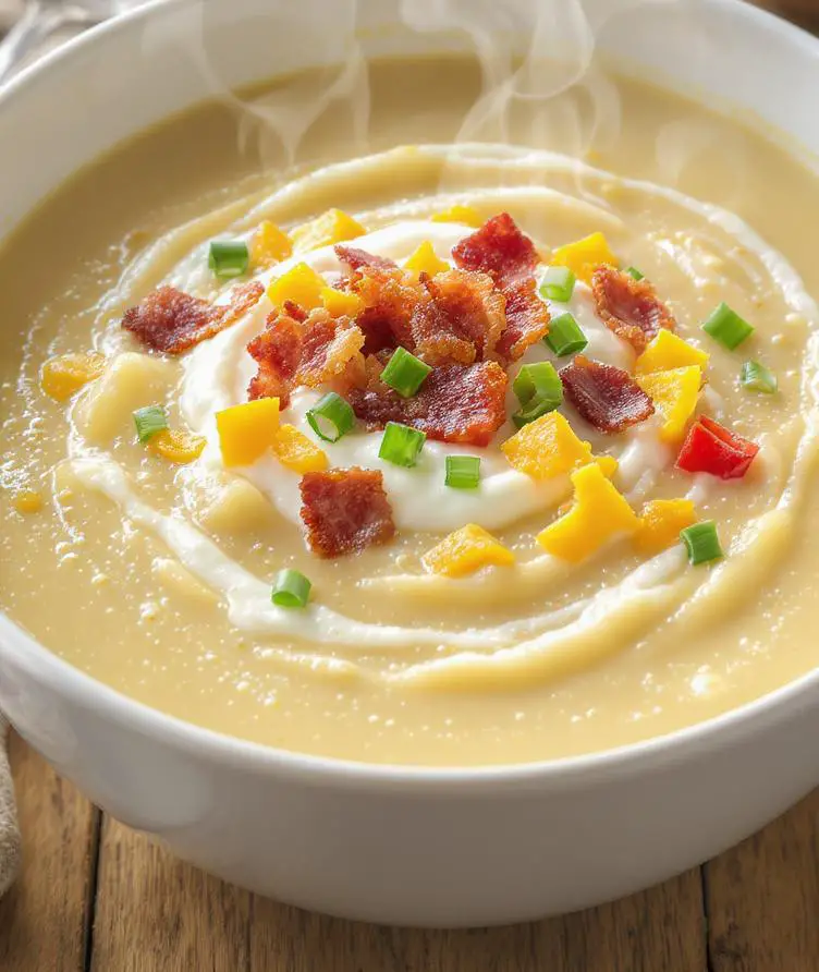 Imagine a velvety base of tender potatoes blended into a rich, creamy broth, paired perfectly with the smoky crunch of bacon and the tangy sharpness of cheddar cheese.