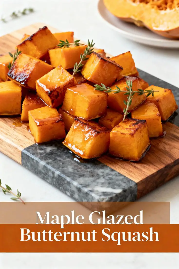 A sweet and savory side dish featuring butternut squash glazed with maple syrup.