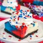 Swirls of colors make these Red White and Blue Cheesecake Bars a fun dessert to share at holiday BBW’s. This super simple red, white, and blue dessert is sure to brighten your Memorial Day and 4th of July picnics.