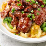 The true joy of this tender Mongolian beef lies in its exquisite taste and texture. Each bite offers a perfect harmony of savory soy sauce, sweet brown sugar, and aromatic ginger, creating a flavor profile that’s bold yet balanced. The beef itself is incredibly tender, with a slight crisp from the cornstarch coating that contrasts beautifully with the glossy, sticky sauce.