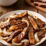 Tender strips of beef stir-fried in a sweet and savory sauce with garlic, ginger, and soy sauce, served over rice for a quick Asian-inspired meal.